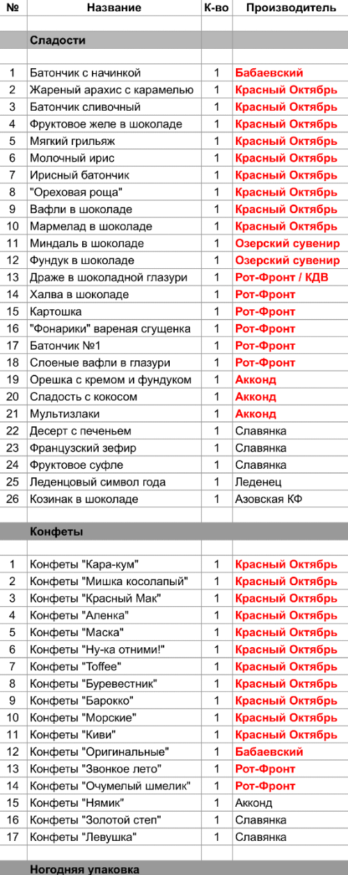 Жареный арахис с карамелью (1 шт), Батончик сливочный (1 шт), Фруктовое желе в шоколаде (1 шт), Мягкий грильяж (1 шт), Молочный ирис (1 шт), Ирисный батончик (1 шт), "Ореховая роща" (1 шт), Вафли в шоколаде (1 шт), Мармелад в шоколаде (1 шт), Конфеты "Кара-кум" (1 шт), Конфеты "Мишка косолапый" (1 шт), Конфеты "Красный Мак" (1 шт), Конфеты "Аленка" (1 шт), Конфеты "Маска" (1 шт), Конфеты "Ну-ка отними!" (1 шт), Конфеты "Toffee" (1 шт), Конфеты "Буревестник" (1 шт), Конфеты "Барокко" (1 шт), Конфеты "Морские" (1 шт), Конфеты "Киви" (1 шт)