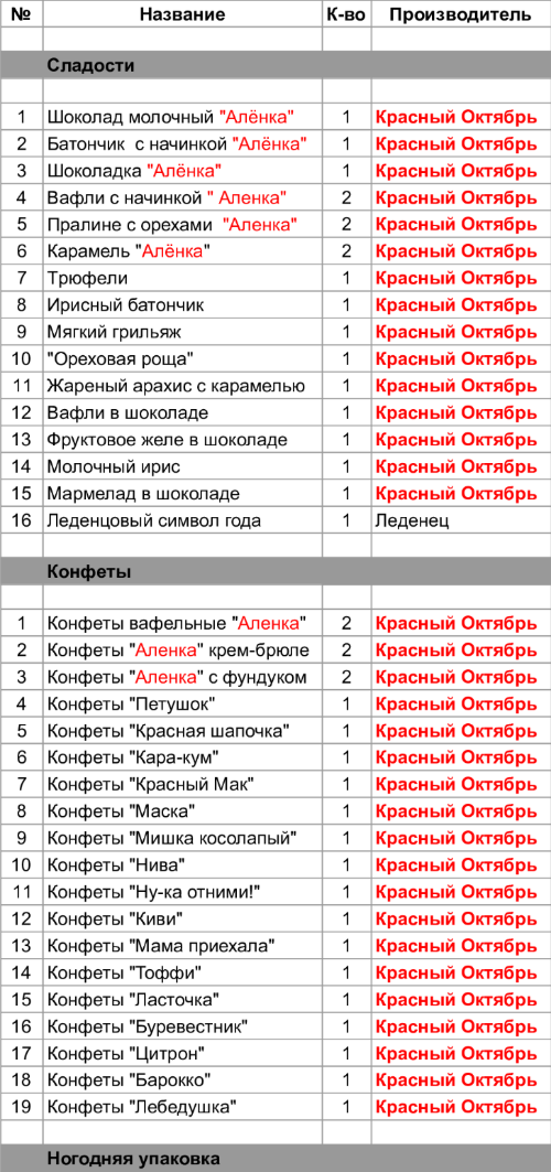 Шоколад молочный "Алёнка" (1 шт), Батончик с начинкой "Алёнка" (1 шт), Шоколадка "Алёнка" (1 шт), Вафли с начинкой " Аленка" (2 шт), Пралине с орехами "Аленка" (2 шт), Карамель "Алёнка" (2 шт), Трюфели (1 шт), Ирисный батончик (1 шт), Мягкий грильяж (1 шт), "Ореховая роща" (1 шт), Жареный арахис с карамелью (1 шт), Вафли в шоколаде (1 шт), Фруктовое желе в шоколаде (1 шт), Молочный ирис (1 шт), Мармелад в шоколаде (1 шт), Конфеты вафельные "Аленка" (2 шт), Конфеты "Аленка" крем-брюле (2 шт), Конфеты "Аленка" с фундуком (2 шт), Конфеты "Петушок" (1 шт), Конфеты "Красная шапочка" (1 шт), Конфеты "Кара-кум" (1 шт), Конфеты "Красный Мак" (1 шт), Конфеты "Маска" (1 шт), Конфеты "Мишка косолапый" (1 шт), Конфеты "Нива" (1 шт), Конфеты "Ну-ка отними!" (1 шт), Конфеты "Киви" (1 шт), Конфеты "Мама приехала" (1 шт), Конфеты "Toффи" (1 шт), Конфеты "Ласточка" (1 шт), Конфеты "Буревестник" (1 шт), Конфеты "Цитрон" (1 шт), Конфеты "Барокко" (1 шт), Конфеты "Лебедушка" (1 шт)