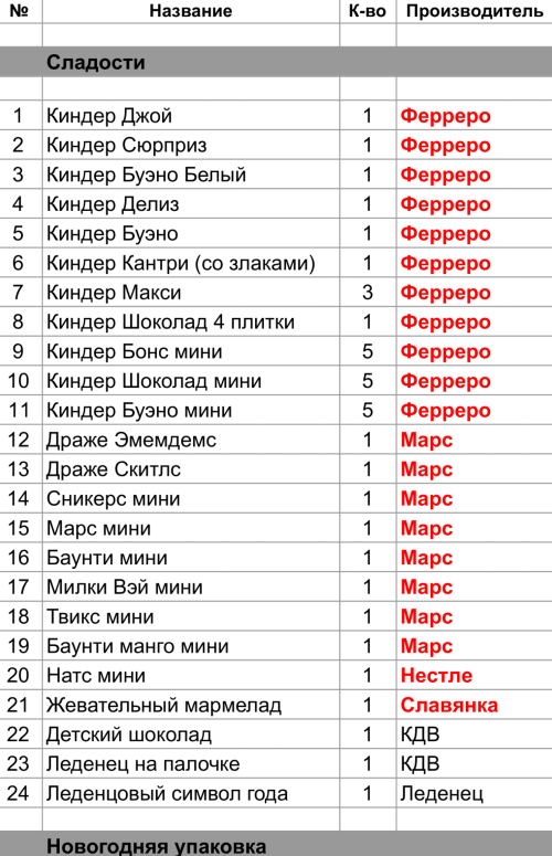 Киндер Джой (1 шт), Киндер Сюрприз (1 шт), Киндер Буэно Белый (1 шт), Киндер Делиз (1 шт), Киндер Буэно (1 шт), Киндер Кантри (со злаками) (1 шт), Киндер Макси (3 шт), Киндер Шоколад 4 плитки (1 шт),Киндер Бонс мини (5 шт), Киндер Шоколад мини (5 шт), Киндер Буэно мини (5 шт)